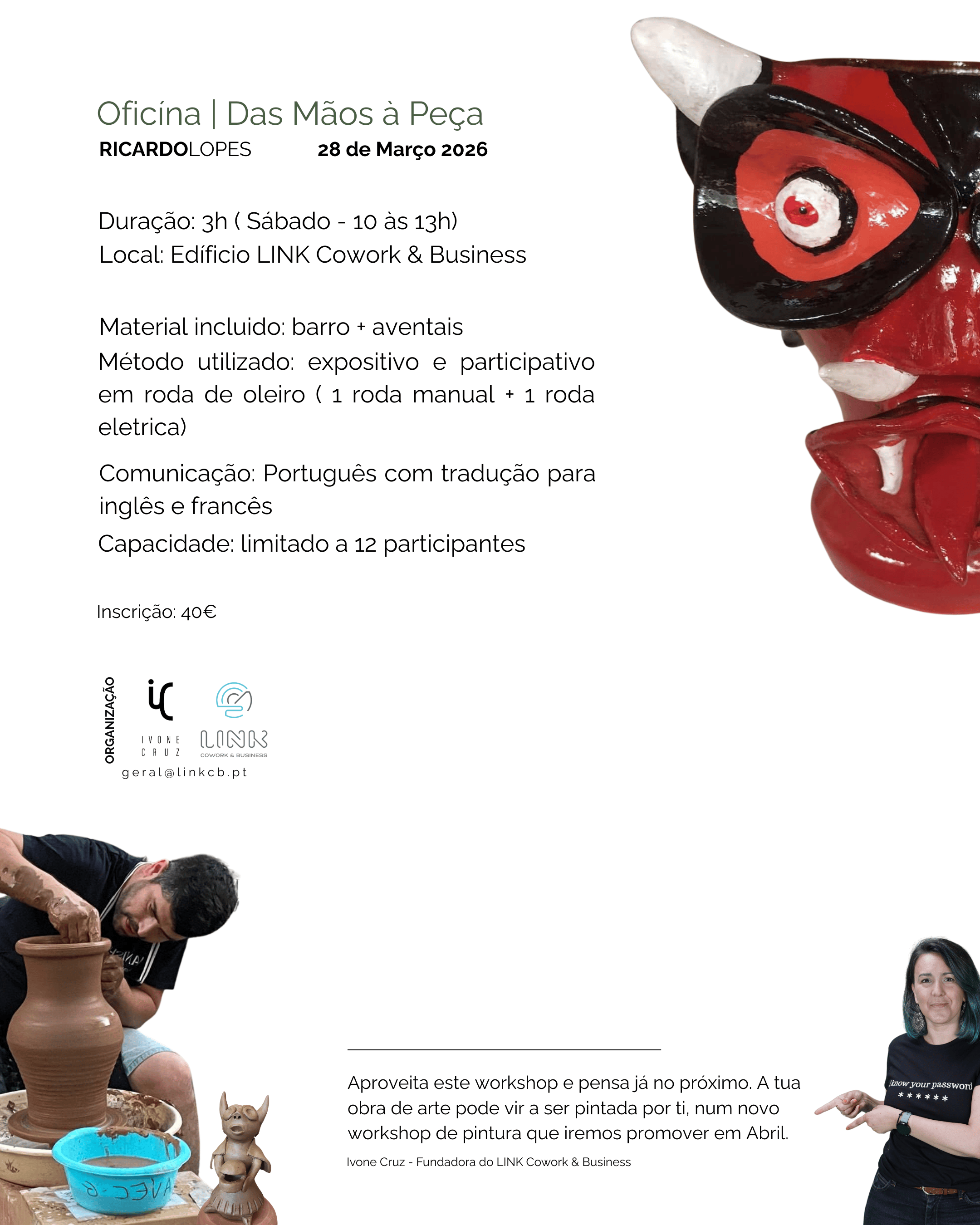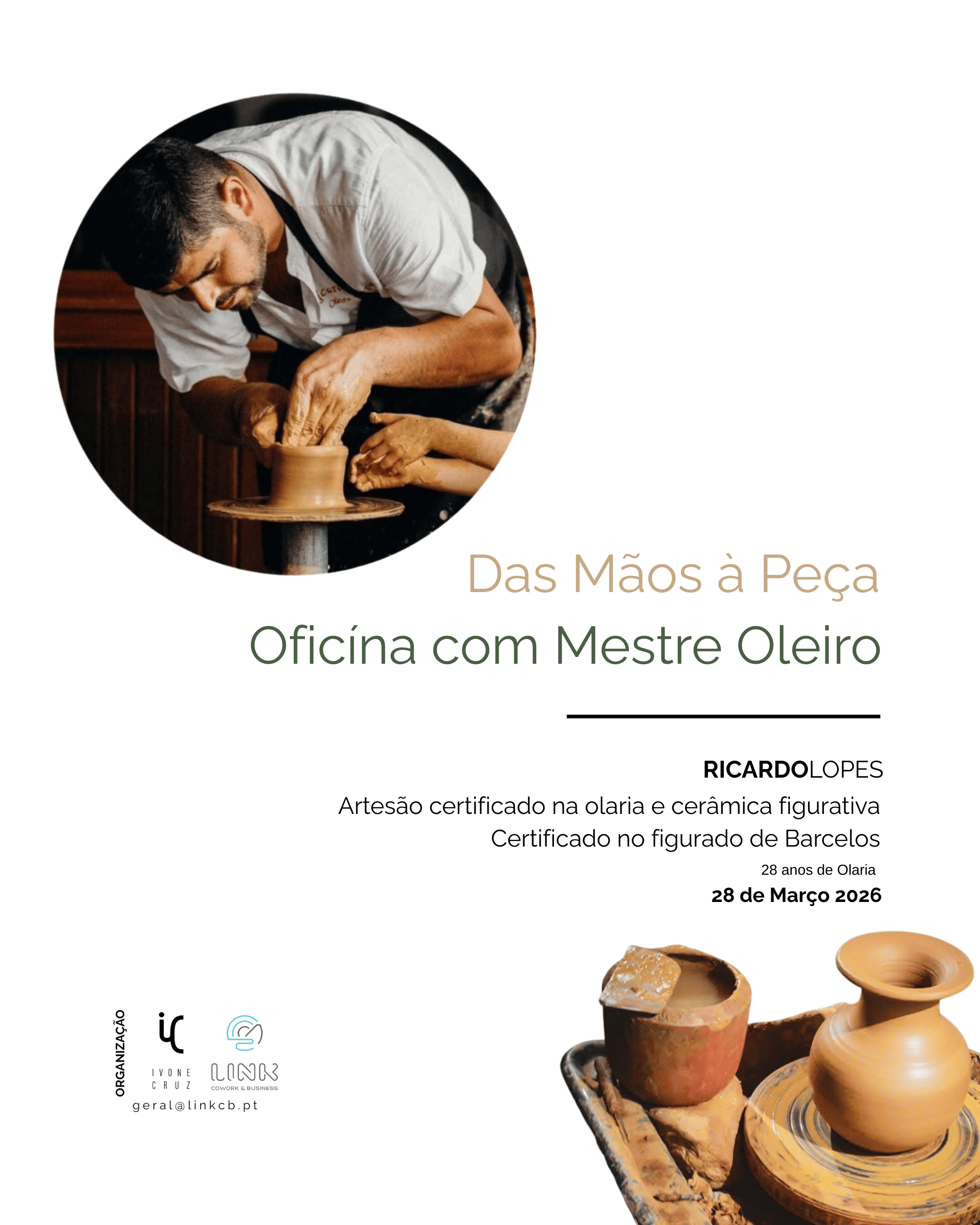 Neste workshop de 3 horas vais trabalhar o barro com as mãos, guiado por Ricardo Lopes — artesão com 2 anos de experiência em olaria e cerâmica figurativa, certificado no Figurado de Barcelos. Um verdadeiro privilégio a não perder.